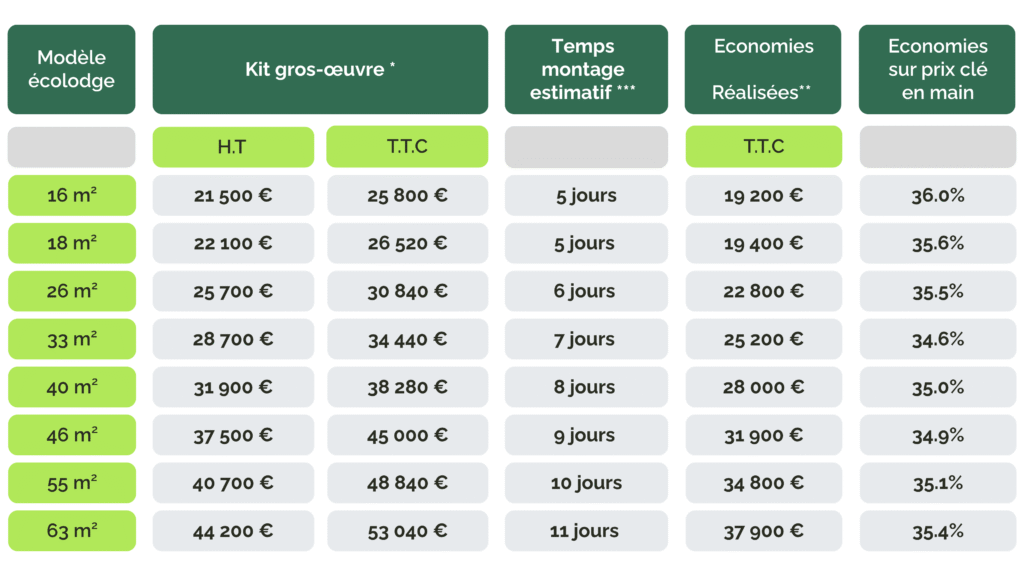 Le kit gros-œuvre comprend l’ensemble des matériaux présentés dans la vidéo de montage. Il ne comprend toutefois pas la terrasse, ni les travaux d’adaptation au sol (tels que le nivellement du terrain ou la réalisation des fondations), ni les raccordements aux réseaux (eau, électricité, assainissement). Ainsi, ces éléments restent à votre charge et devront être prévus séparément.