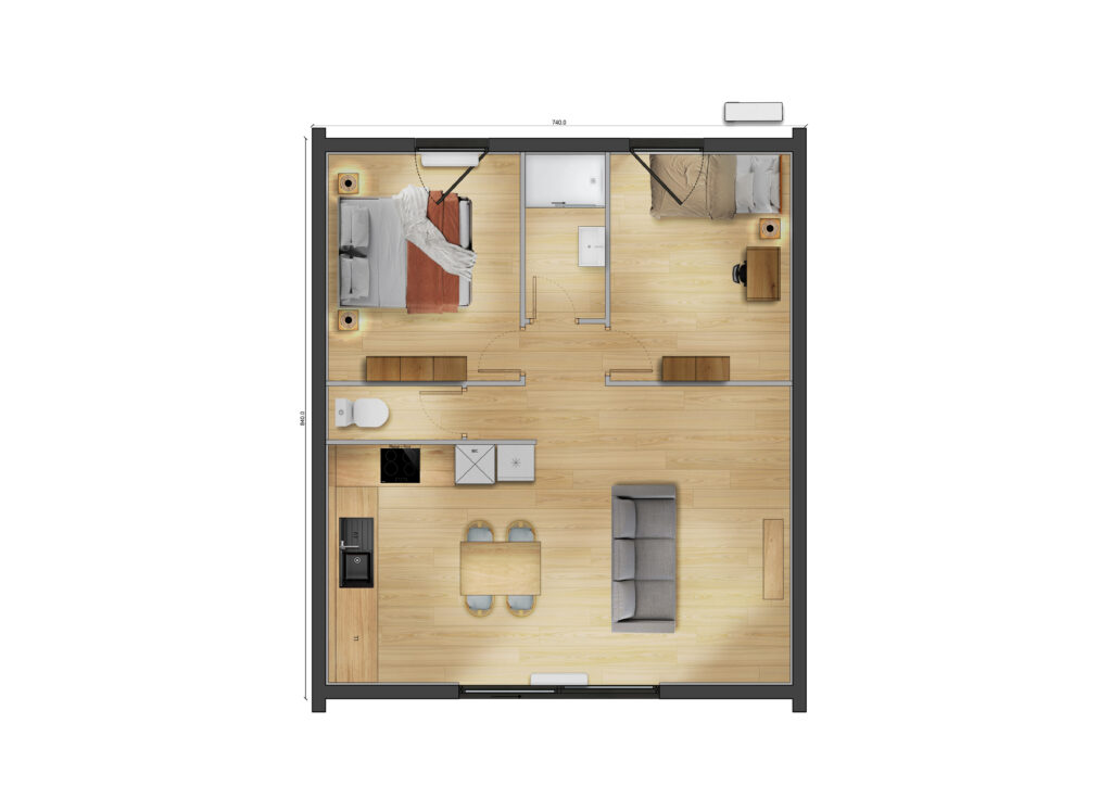 Avec ses 55 m² et sa hauteur sous plafond de 3,5 m, cet écolodge se rapproche d’un véritable logement résidentiel. Il dispose de 2 grandes chambres séparées, d’une salle d’eau moderne et fonctionnelle, de WC indépendants et d’une grande pièce de vie intégrant cuisine équipée, coin repas et salon spacieux. Pensé aussi bien pour les particuliers (résidence principale compacte, logement indépendant, résidence secondaire) que pour les professionnels (gîtes, campings premium, location saisonnière type Airbnb), ce modèle allie modularité, confort moderne et performance bas carbone.